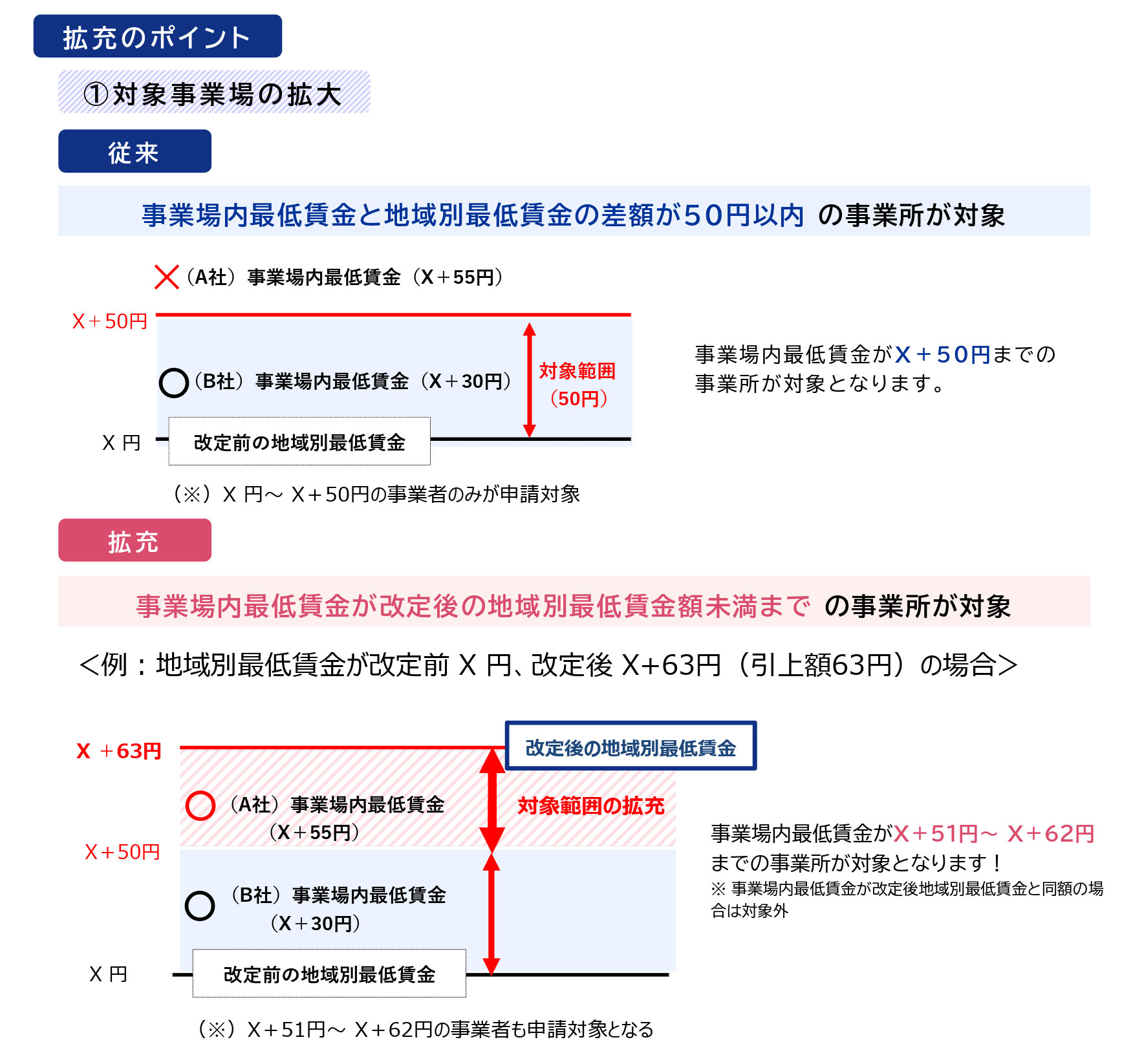 例えば、地域別最低賃金が改定前X円から改定後X+63円に引き上げられる場合、事業場内最低賃金がX+51円からX+62円までの事業所も新たに助成の対象となります。事業場内最低賃金がX+55円であった企業(A社)は、これまでは申請対象外でしたが、拡充後は申請対象となります。