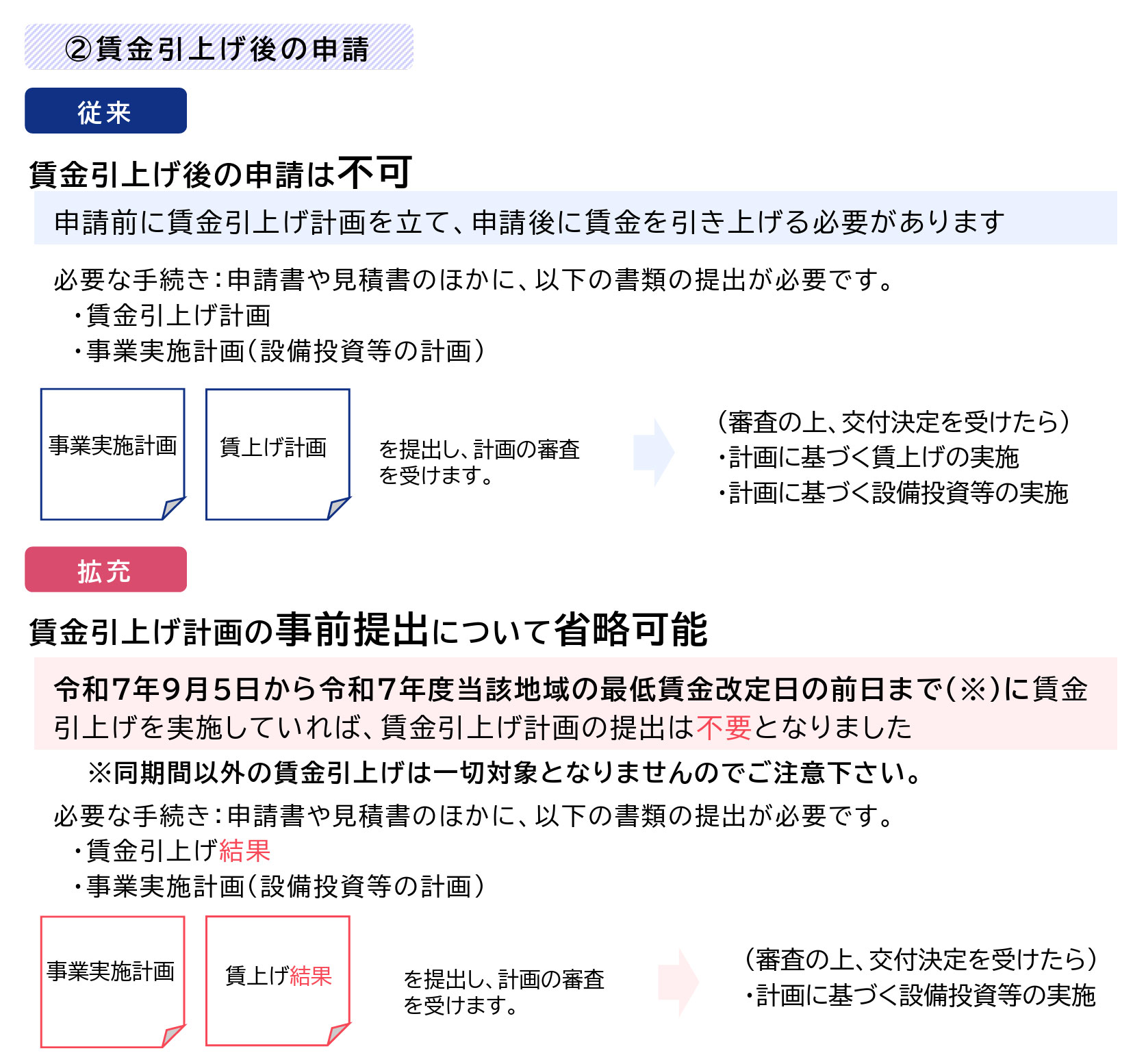 この場合、必要な手続きとして、申請書や見積書のほかに、 賃金引上げ結果と事業実施計画を提出する形での申請が可能となります。 |