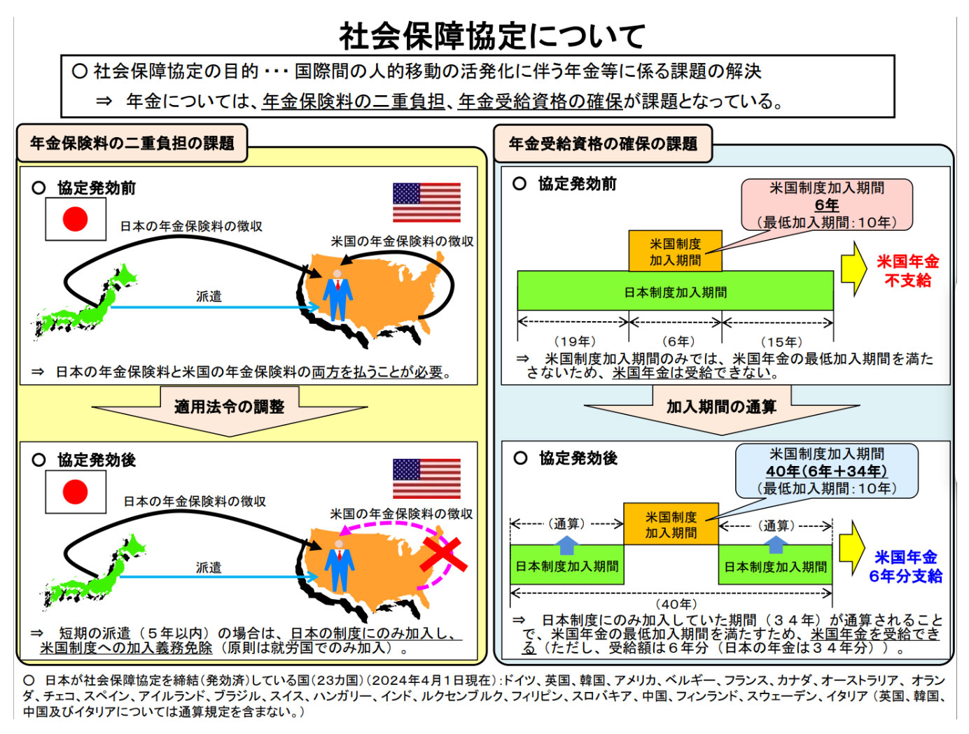 このように、社会保障協定は「二重払いの防止」と「年金受給資格の確保」を目的としています。