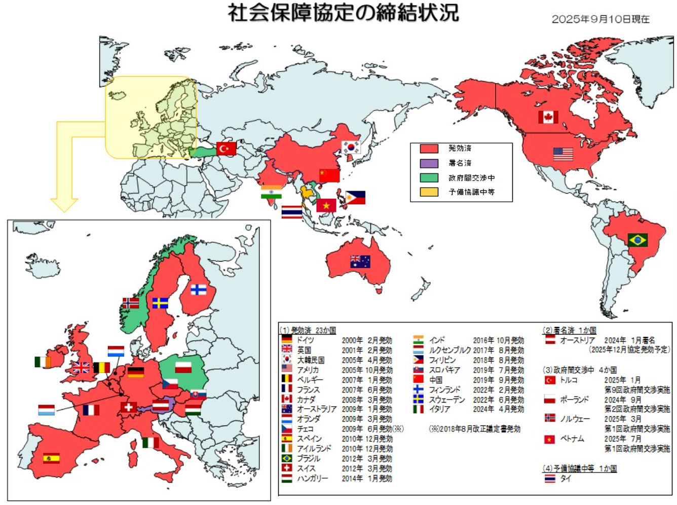 9月10日、日・オーストリア社会保障協定(令和6年1月19日署名)の効力発生のための外交上の公文の交換(これをもって、「締結」となります)がオーストリア共和国の首都ウィーンで行われました。これにより、この協定は12月1日に効力を生ずることとなります。